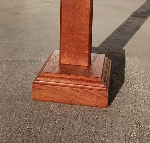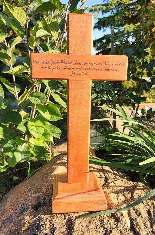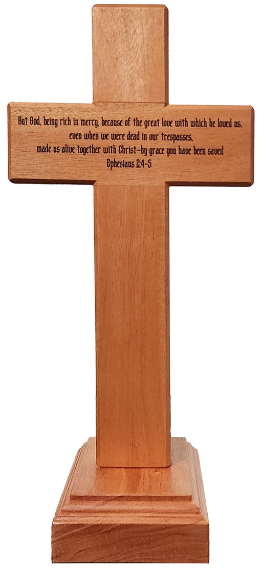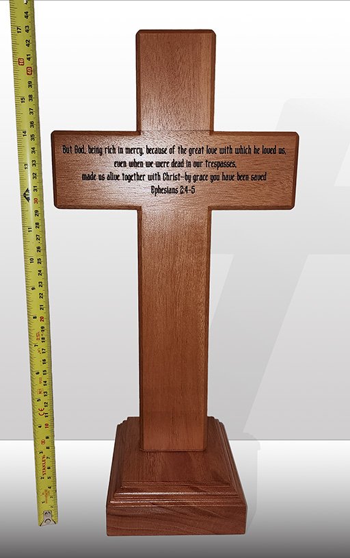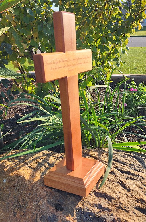 These customizable wooden crosses are sealed with a stain or simple clear coat for protection. The cross and base are one piece and stand on their own. Please look at the photos for a size reference to my hand. The wood varies from grain pattern, knots, and color so each piece will be unique and different.